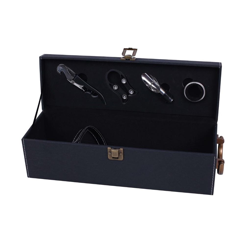Este estojo robusto é feito de couro sintético, proporcionando durabilidade e um acabamento aprimorado. Ele foi projetado para acomodar uma garrafa de vinho de tamanho padrão de forma segura e elegante. A parte interna conta com compartimentos específicos para cada um dos acessórios, mantendo-os organizados e protegidos. O fecho prático garante que o conteúdo permaneça no lugar durante o transporte.