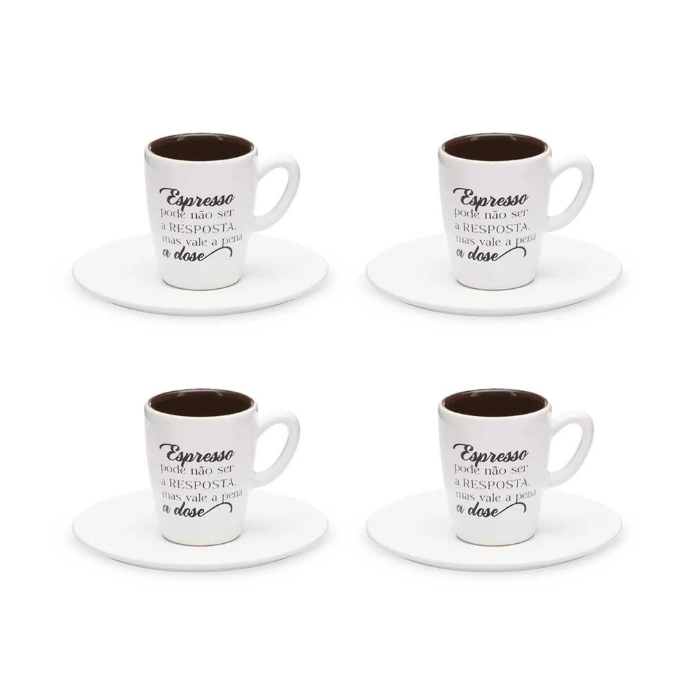 O Jogo de 4 Xícaras de Cafezinho Expresso Dose é perfeito para tornar seu cantinho do café ainda mais convidativo. Celebrando a paixão pela bebida, cada xícara é decorada com a frase: ?Espresso pode não ser a resposta, mas vale a pena a dose?.