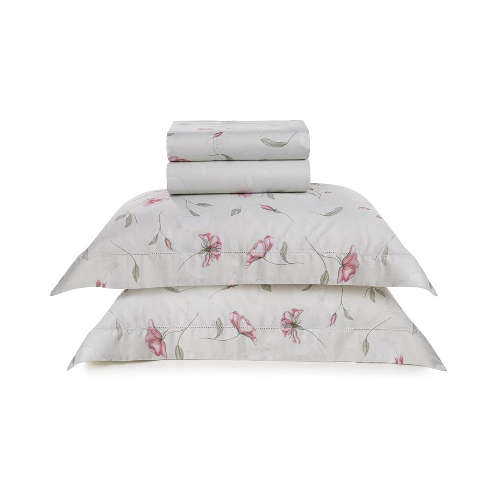 Acabamento: Estampa floral inspirada na mitologia, toque acetinado, tecido sanforizado e mercerizado, fronhas com 3 abas e acabamento em ponto ajour
