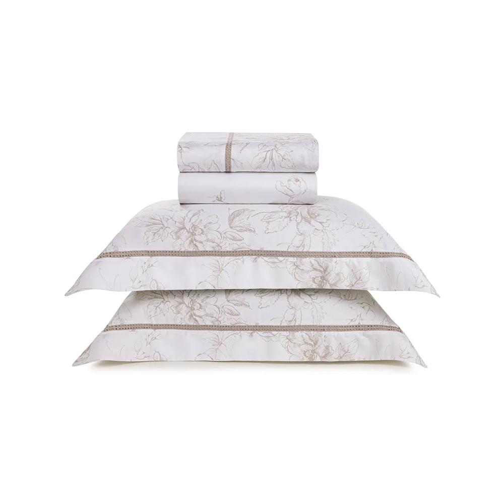 Combinação de Cores: Fundo branco com estampa em cor Legno, retratando flores com arte feita à mão e aplicação de entremeio bordado no sobrelençol e nas fronhas