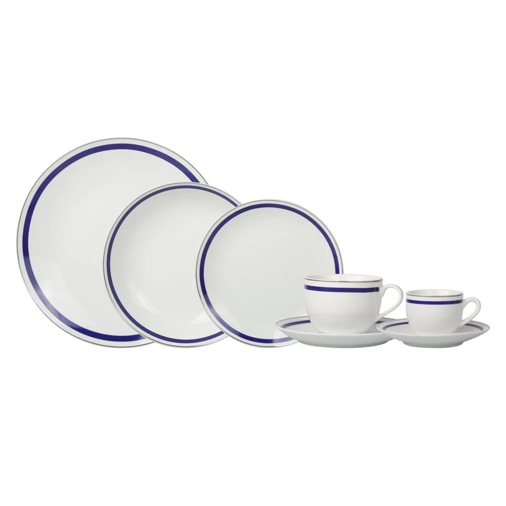 6 Pratos Rasos, 6 Pratos de Sobremesa, 6 Pratos Fundos, 6 Xícaras de Chá, 6 Pires de Chá, 6 Xícaras de Café, 6 Pires de Café
