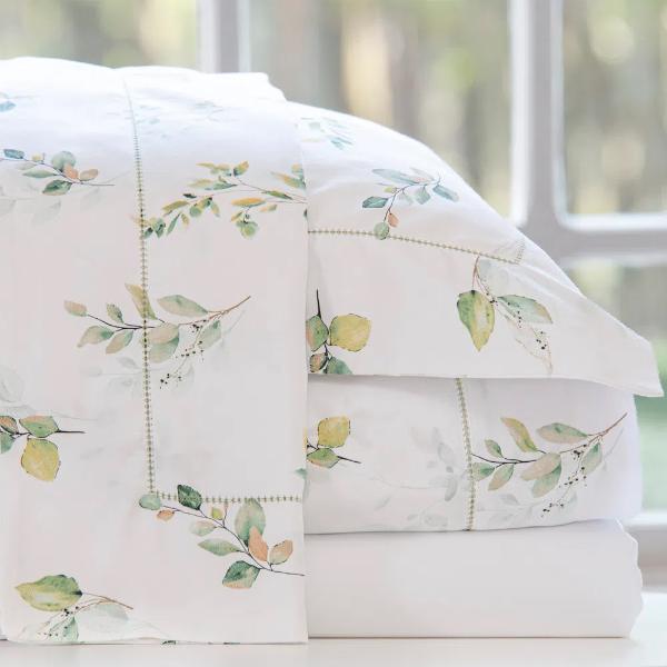 Jogo de lençol Scavone Leaves King 300 fios 100% Algodão Estampado. Lençol inferior liso branco com elástico; Lençol superior branco com estampa floral, vira de dobra feita e acabamento em ponto ajour verde; Fronha branca com estampa floral, 3 abas com acabamento em ponto ajour verde; Em tecido Cetim 300 fios, 100% Algodão ? fio penteado, toque acetinado. Uma estampa linda em um tecido leve de toque maravilhoso.