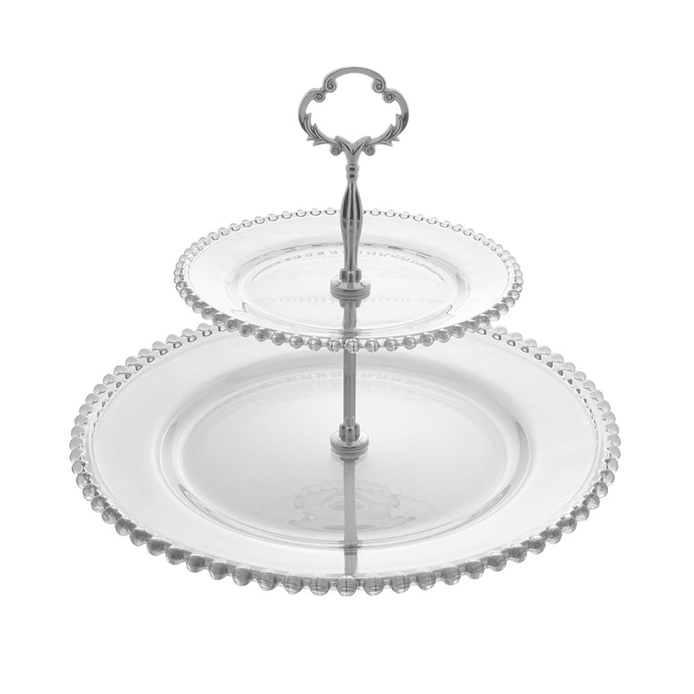 Fabricado em cristal, este prato duplo exibe um brilho e uma transparência que realçam a beleza do que é servido. O grande destaque fica por conta do seu design "Pearl" (Pérola), uma borda finamente trabalhada com delicadas bolinhas em relevo que confere um charme clássico e atemporal. A disposição em dois andares otimiza o espaço na mesa e permite criar uma exibição visualmente rica e organizada.