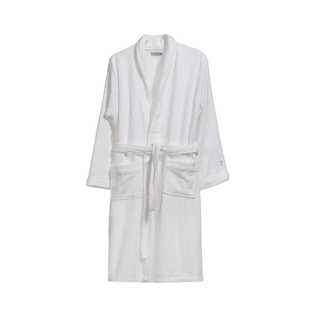 O Roupão Barone Branco Trussardi é a escolha ideal para quem busca um equilíbrio perfeito entre sofisticação e conforto. Confeccionado com 100% algodão e tecnologia Cotone Speciale, o roupão oferece um toque aveludado e uma sensação envolvente. A nova modelagem, somada aos detalhes refinados, como o bordado do "T" nas mangas, traz um toque de classe. Com fibras leves e super macias, ele garante um caimento impecável e transforma seu momento de autocuidado em uma experiência de spa.