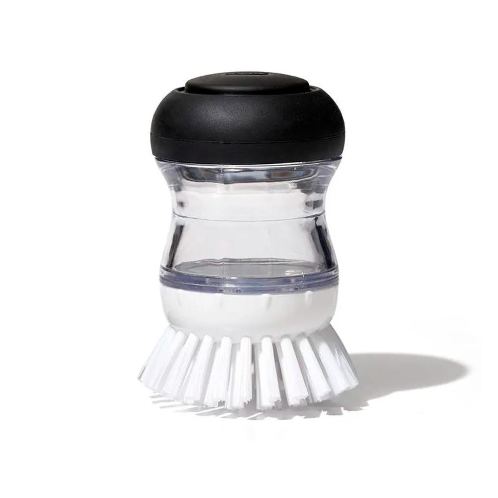 Libere controladamente o sabão com a nossa escova e dispensador. Com um leve toque no botão, o sabão é lançado para o item que está sendo esfregado. Forma arredondada para conforto ideal e poder de lavagem. As cerdas de nylon duráveis são seguras para panelas e assadeiras antiaderentes.
