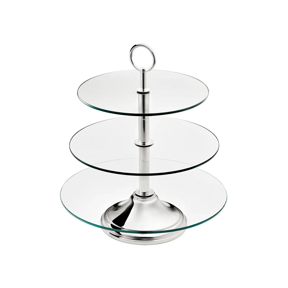 A estrutura é composta por uma base robusta em latão com banho de prata e três pratos redondos em vidro temperado.