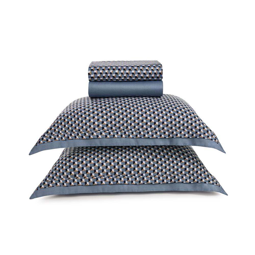 Acabamento: Toque acetinado, fronha com 3 abas duplas, sobre lençol estampado, lençol de elástico tinto