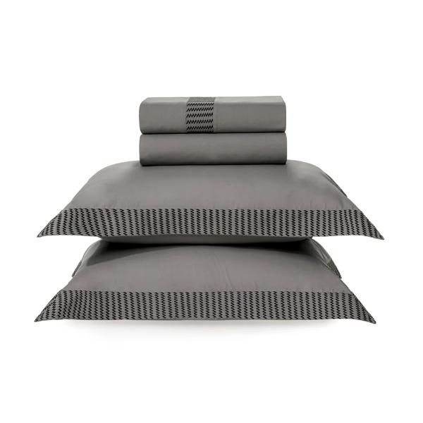 O bordado em duas cores da cama Scarpe aplicado na aba, é a representação dos caminhos de Bérgamo, suas ruas e texturas. Versátil, se apresenta em uma versão contemporânea e outra clássica, denotando autenticidade. Dobra feita com entremeio bordado, Lençol com elástico