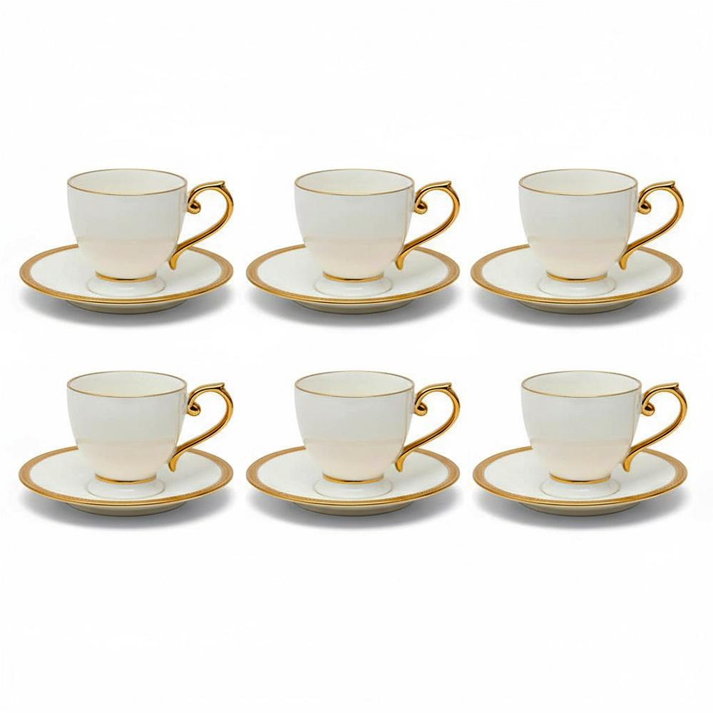 Cada xícara e pires é meticulosamente trabalhado em porcelana, material conhecido pela sua delicadeza e acabamento impecável. O Modelo Paddy se destaca pelo design clássico na cor branca, adornado com um filete dourado nas bordas. Este detalhe sutil confere um toque de luxo e faz com que cada peça brilhe na sua mesa posta, sendo perfeita para receber convidados ou para desfrutar de um momento especial.