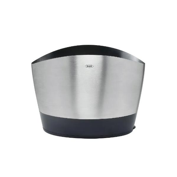 Graças à sua forma curvada, o porta utensílios cabe em áreas estreitas ou rente a uma parede.