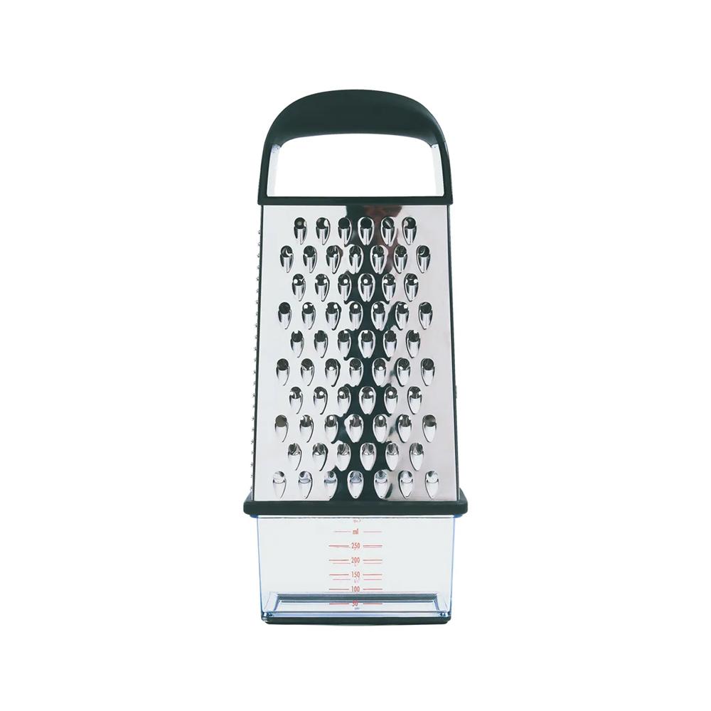 Produzido pela Americana OXO Good Grips, este ralador possui 4 faces para diferentes cortes. Dispenser graduado com tampa, alça macia e base emborrachada. Ralador em aço inox de alta qualidade com 4 faces para diferentes tipos de corte, raladores para corte grosso ideal para vegetais e queijos, corte fino para nos moscada e gengibre e fatiador excelente para pepinos e abobrinhas. Seu dispenser com tampa que evita sujeira e desperdício, podendo ser levado a geladeira mantendo o alimento fresco.
