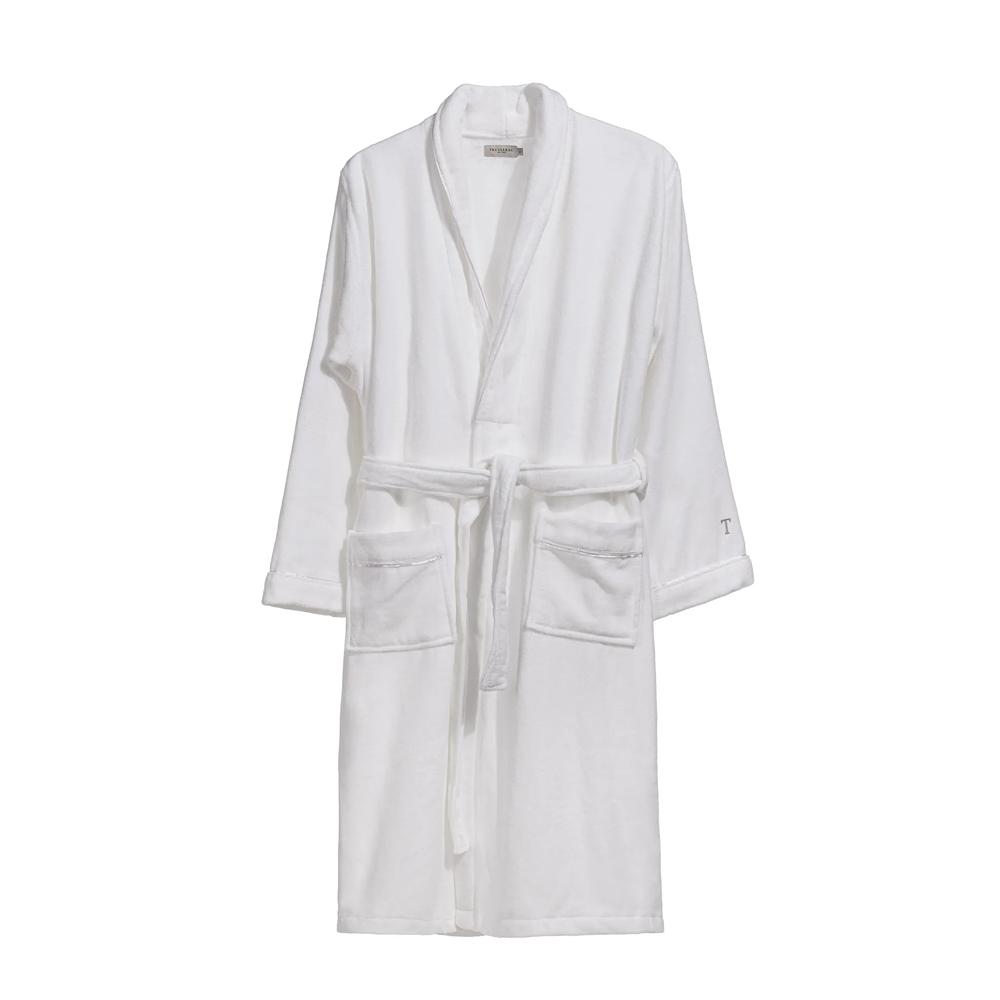 O roupão Barone da Trussardi é um convite ao conforto e ao bem-estar. Confeccionado em 100% algodão com tecnologia Cotone Speciale, proporciona toque aveludado, extrema maciez e caimento impecável. Seu design sofisticado conta com acabamento refinado, viés nas bordas e bordado do icônico "T" nas mangas, garantindo um toque de elegância. Ideal para transformar momentos de autocuidado em uma experiência digna de spa.